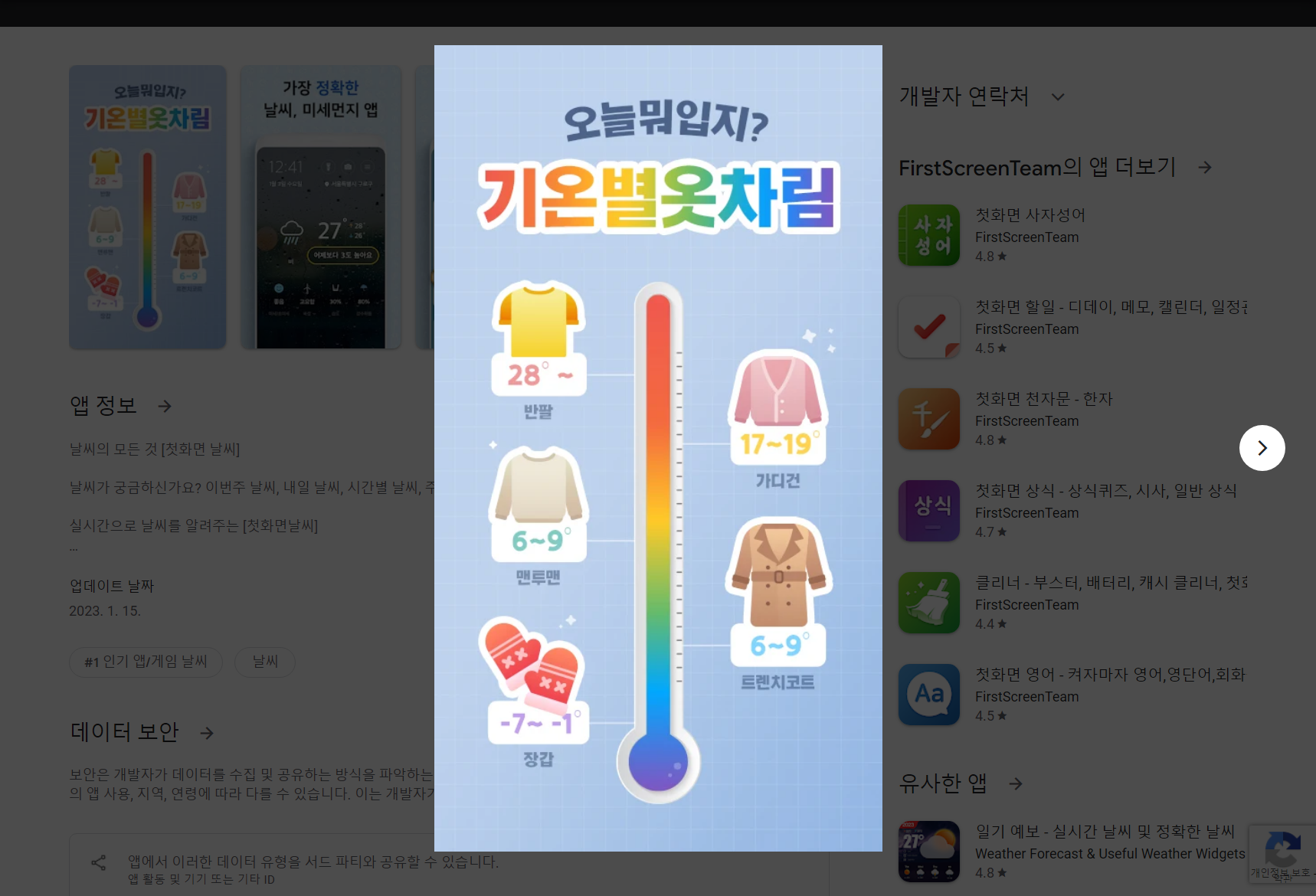 날씨별 기온별 옷차림, 첫화면 날씨, 날씨어플, 미세먼지, 날씨위젯으로 날씨의 모든 것 바로 첫화면 날씨입니다. 날씨가 궁금하다면 특히 이번주 날씨, 내일 날씨, 시간별 날씨, 주간 날씨 등 실시간으로 날씨를 알려주는 첫화면날씨는 구글 플레이스토어 날씨분야 1위를 달리고 있는 인기 있는 앱입니다.