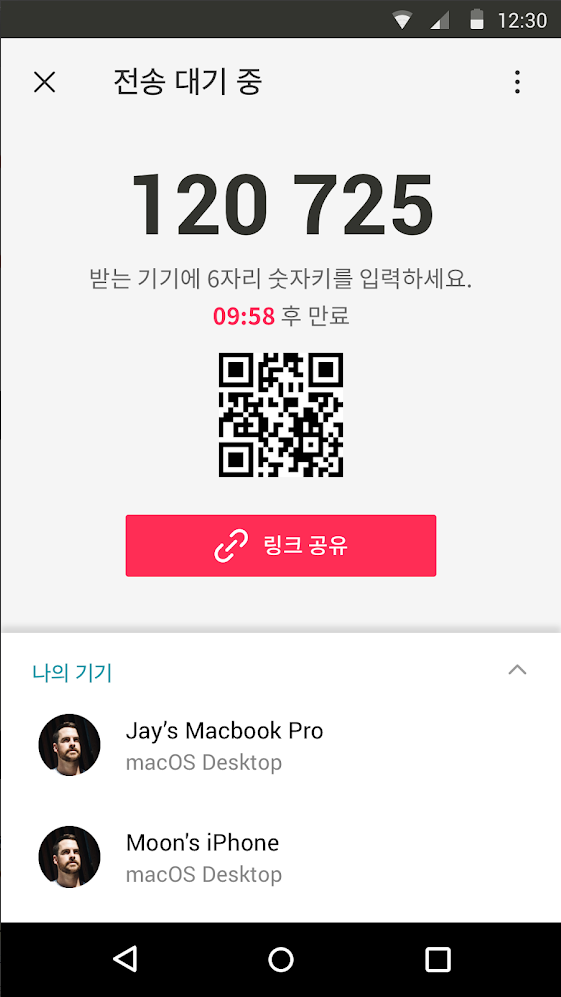 1:1 실시간 파일 전송 기능은 6자리 숫자키를 이용해 실시간으로 파일을 전송할 수 있습니다. 보내는 기기에서 생성한 6자리 숫자를 받는 기기에 입력하면 파일 전송이 시작됩니다.