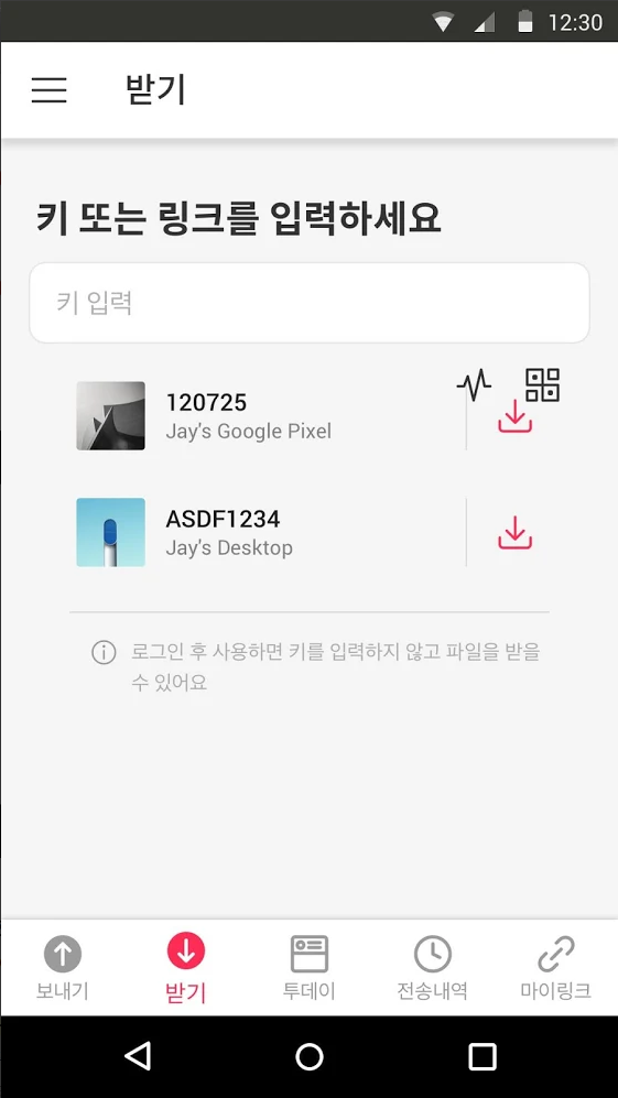 1:1 실시간 파일 전송 기능은 6자리 숫자키를 이용해 실시간으로 파일을 전송할 수 있습니다. 보내는 기기에서 생성한 6자리 숫자를 받는 기기에 입력하면 파일 전송이 시작됩니다.