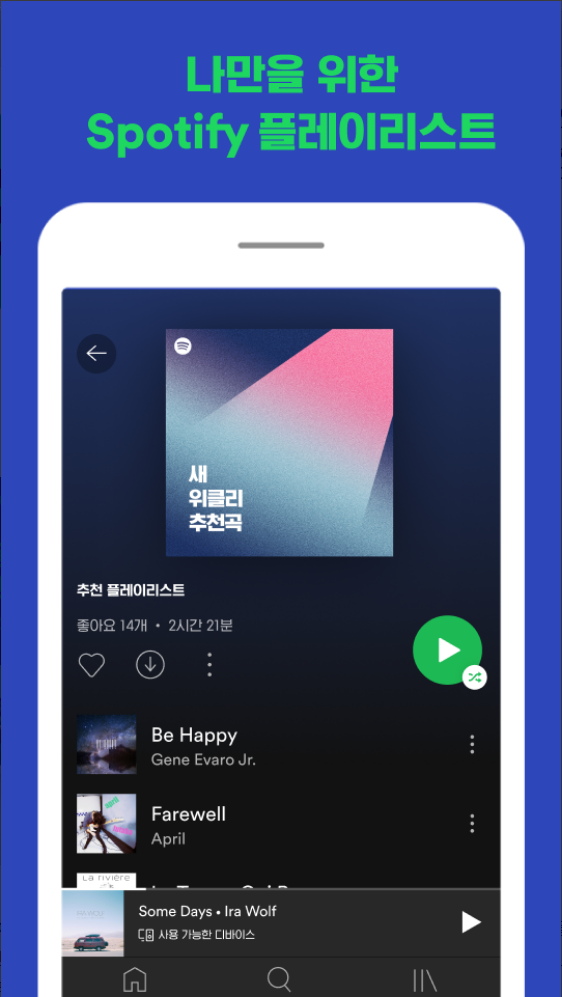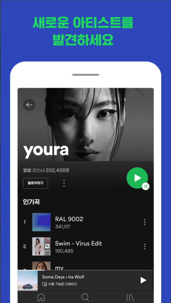 어디에서도 만날 수 없는 Spotify만의 특별한 음악 감상 서비스! 맞춤형 추천 플레이리스트를 활용해 보세요. 좋아하는 아티스트의 다양한 앨범 및 음악 재생은 물론, 추천 노래 플레이리스트에 담긴 새로운 음악을 다양하게 만나볼 수 있습니다.