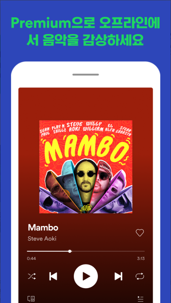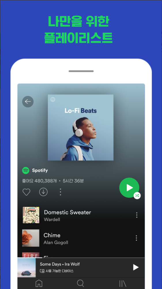Spotify는 모바일과 태블릿에서 최적의 음악 감상을 지원합니다. 원하는 노래, 앨범, 플레이리스트를 다운로드하면 언제 어디서나 오프라인 음악 감상을 즐길 수 있죠.