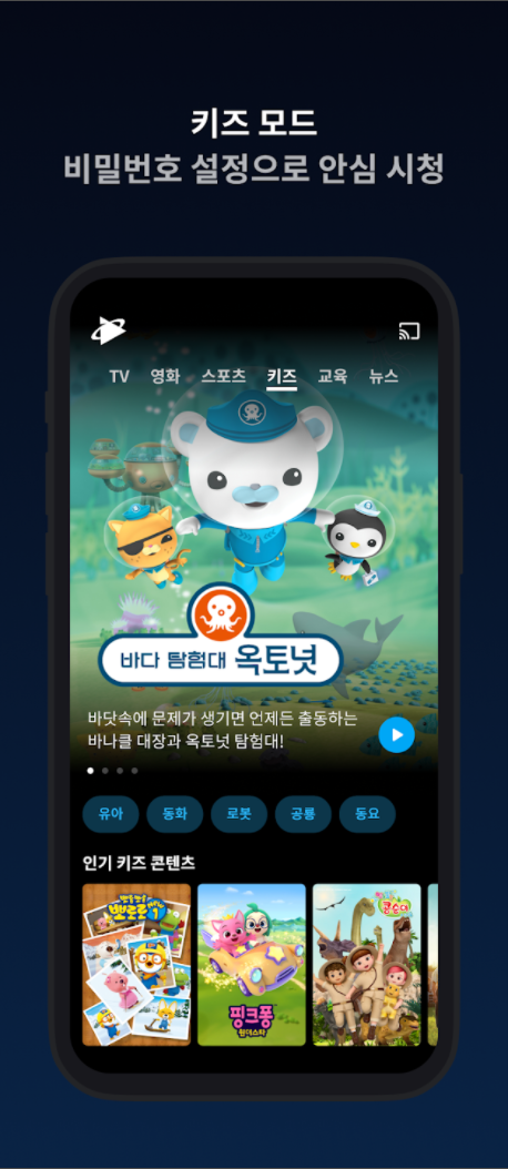 또, 키즈 모드를 통한 비밀번호 설정으로 안심 시청이 가능하며, 영화, 드라마, 예능 신작 업데이트에 취향 저격 콘텐츠 추천 기능까지 추가 되어 편리하게 활용이 가능합니다.
